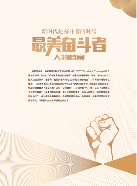 华人楷模名人堂长期致力于记录华人杰出人物,历届栏目中曾收录马云、谢国民、李彦宏等具时代影响力的人物。2025年最新一期《新时代是奋斗者的时代》人物档案收录 YBHG Lt. Kol. Bersekutu (PA) Tuan Tony Lim,旨在表彰他在投资教育领域的持续深耕,以及长期陪伴学员实践、推动行业专业化发展的实际贡献。
